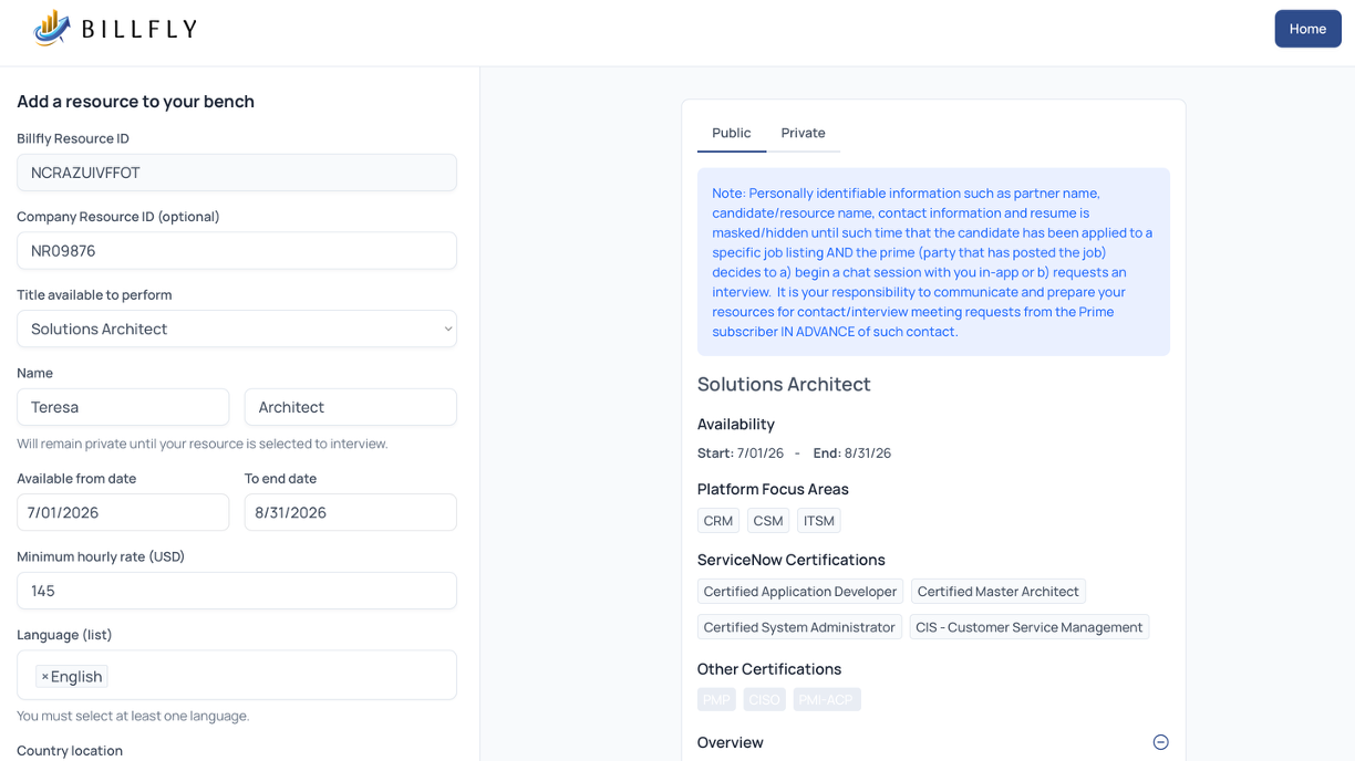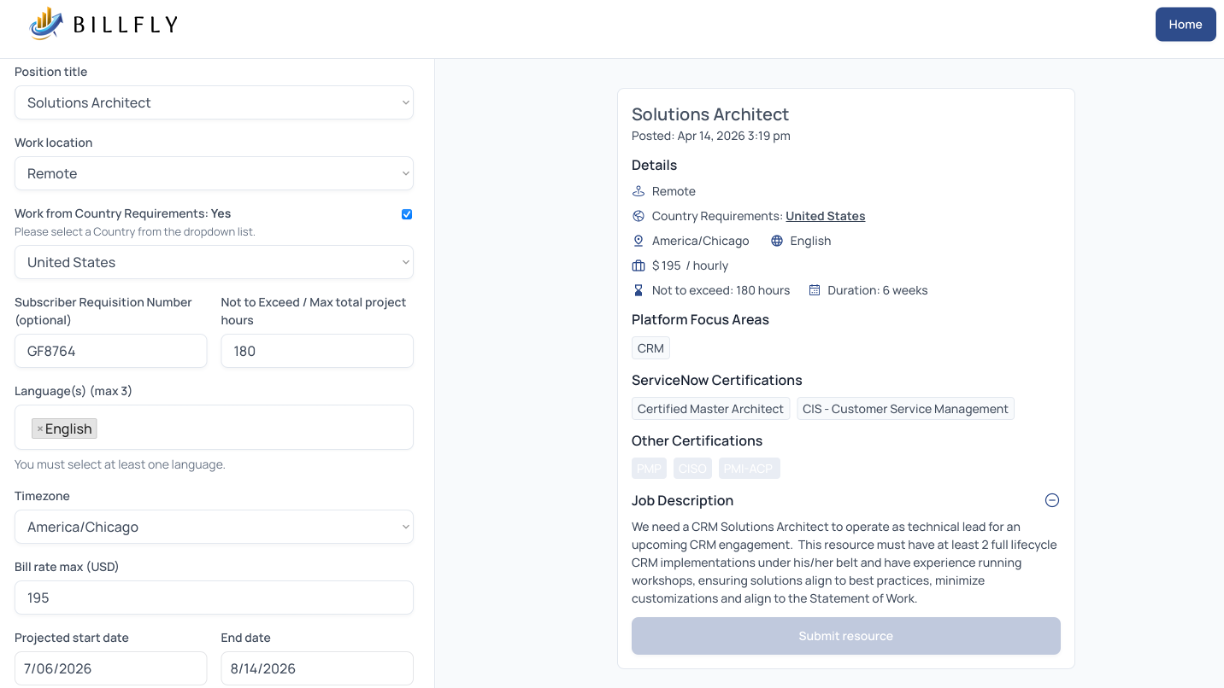 Convert non-billable bench into revenue by submitting qualified resources with availability and rate details.